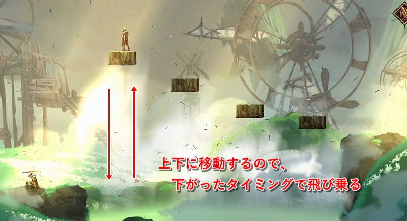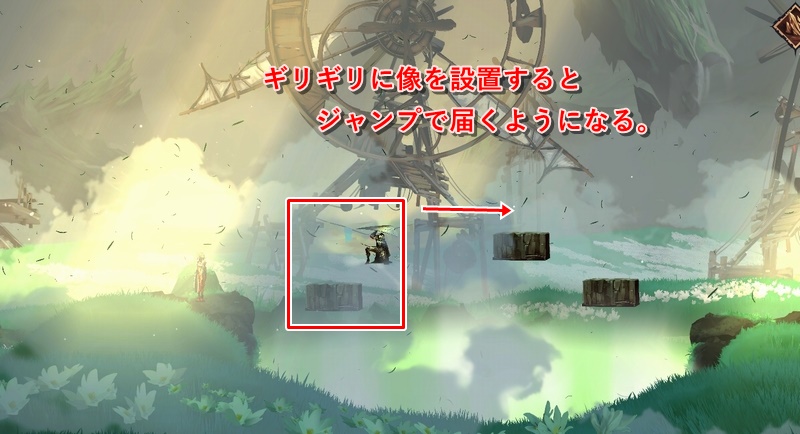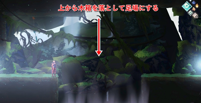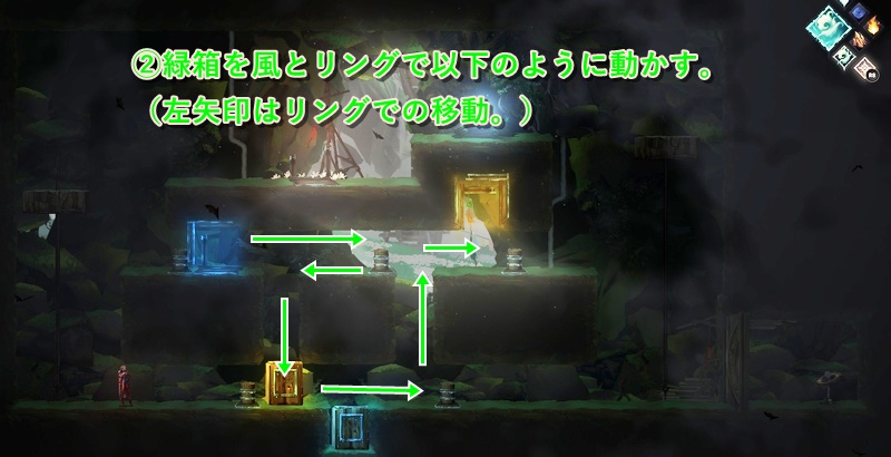 途中の足場がない場所では、上側に木箱があるので、それを風リングで落として足場にする。