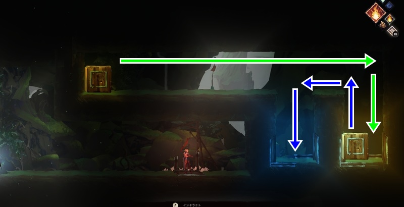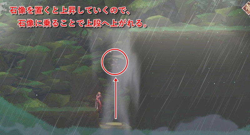 右方向に進んでいき、3つの足場の場所は最初の足場ギリギリに石像を置けばジャンプが届く。