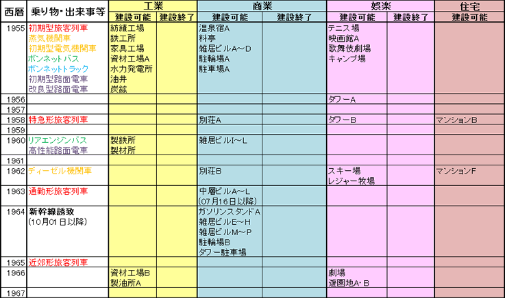 | 1955 | 初期型旅客列車 蒸気機関車 初期型電気機関車 ボンネットバス ボンネットトラック 初期型路面電車 改良型路面電車 | 紡績工場 鉄工所 家具工場 資材工場A 水力発電所 油井 炭鉱 | 温泉宿A 料亭 雑居ビルA~D 駐輪場A 駐車場A | テニス場 映画館A 歌舞伎劇場 キャンプ場 | |||||