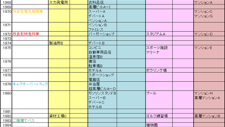 | 1982 | 資材工場C | ゴルフ練習場 | 高層マンションB | ||||||