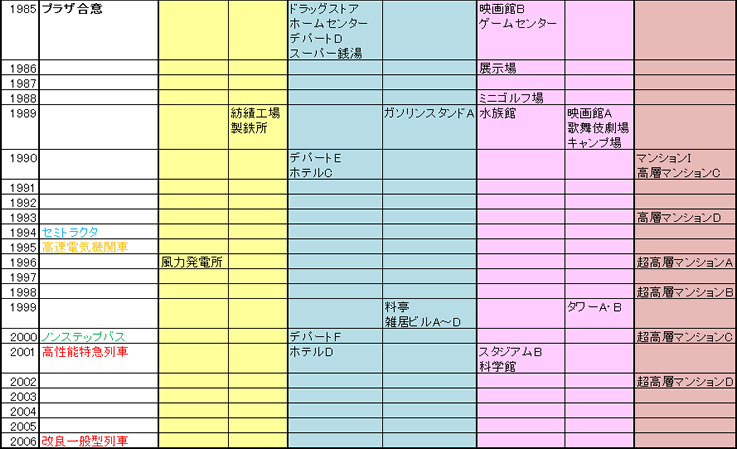 | 1985 | プラザ合意 | 一般形旅客列車 | ドラッグストア ホームセンター デパートD スーパー銭湯 | 映画館B ゲームセンター | |||||